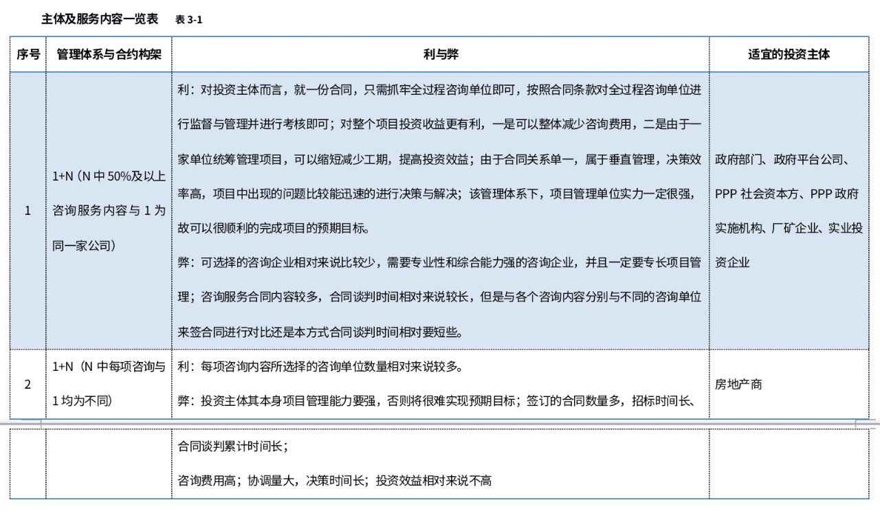 不同的投資主體所需的服務(wù)內(nèi)容和管理模式不一樣,就會(huì)導(dǎo)致項(xiàng)目管理體系上和合約構(gòu)架上不一樣,以下通過(guò)表格闡述不同的管理體系和合約構(gòu)架的利與弊及適宜的投資主體(本文倡導(dǎo)的全過(guò)程咨詢(xún)以項(xiàng)目管理為主線,用1表示,前期咨詢(xún)、監(jiān)理、造價(jià)、招標(biāo)代理、勘察設(shè)計(jì)管理等用N表示):