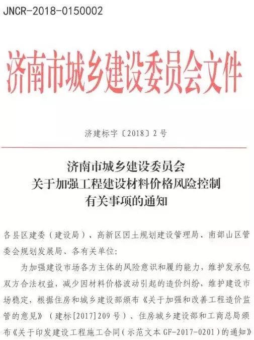 2018年1月30日,濟(jì)南市住建委印發(fā)《關(guān)于加強(qiáng)工程建設(shè)材料價(jià)格風(fēng)險(xiǎn)控制有關(guān)事項(xiàng)的通知》(濟(jì)建標(biāo)字〔2018〕2號),明確工程計(jì)價(jià)中應(yīng)推行風(fēng)險(xiǎn)共擔(dān)和合理分?jǐn)傇瓌t,承包人應(yīng)有限度承擔(dān)材料價(jià)格等市場風(fēng)險(xiǎn)。