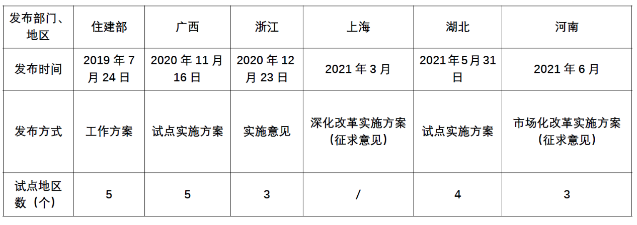 2020年7月24日,住房和城鄉建部辦公廳印發關于工程造價改革工作方案的通知(建辦標〔2020〕38號,以下簡稱38號文),通知決定在北京市、浙江省、湖北省、廣東省、廣西壯族自治區等五個地區開展方案試點工作。截至本稿起筆日(2021.6.3),廣西、浙江和湖北等三個試點地區相繼發布有關方案通知,北京、廣東尚未見官方相關信息。五個試點城市外,上海、河南等地的方案在征求意見中。