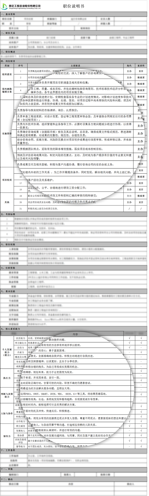 為優(yōu)化人才隊(duì)伍結(jié)構(gòu)及提高能力素質(zhì),鼎正人資部與造價(jià)咨詢事業(yè)部通過對(duì)項(xiàng)目經(jīng)理崗位職責(zé)進(jìn)行列舉和歸類,對(duì)工作流程、部門內(nèi)各職位間的職責(zé)分配進(jìn)行分析和規(guī)劃,共同編寫了造價(jià)咨詢事業(yè)部項(xiàng)目經(jīng)理崗位說明書,以便項(xiàng)目經(jīng)理和準(zhǔn)項(xiàng)目經(jīng)理們?nèi)轿涣私夤ぷ髂繕?biāo)以及在個(gè)人能力素質(zhì)方面的差距,從而制定合理的學(xué)習(xí)計(jì)劃。