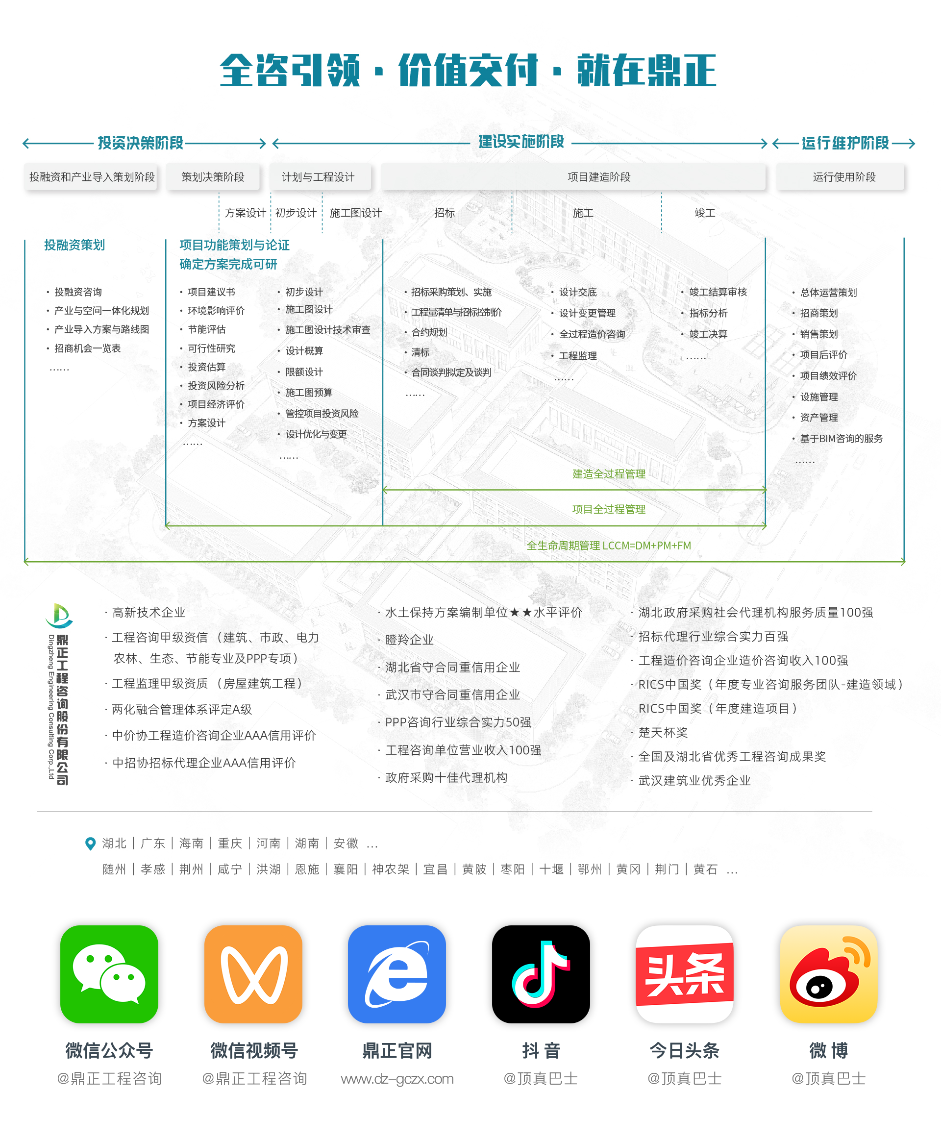 鼎正工程咨詢有限公司成立于2006年5月,公司具有工程咨詢、項目管理、工程造價咨詢、工程招標代理、土地規劃設計等多項專業咨詢資質...